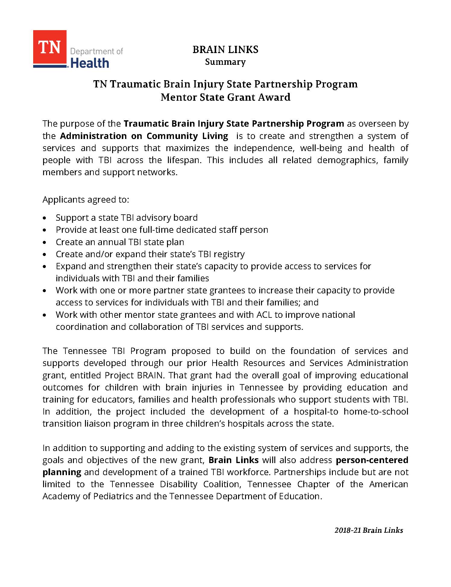 The Tennessee Department of Health, Traumatic Brain Injury Program was awarded a three-year Traumatic Brain Injury State Partnership Program grant from the Administration on Community living to create and strengthen a system of services and supports that maximizes the independence, well-being and health of people with TBI across the lifespan.